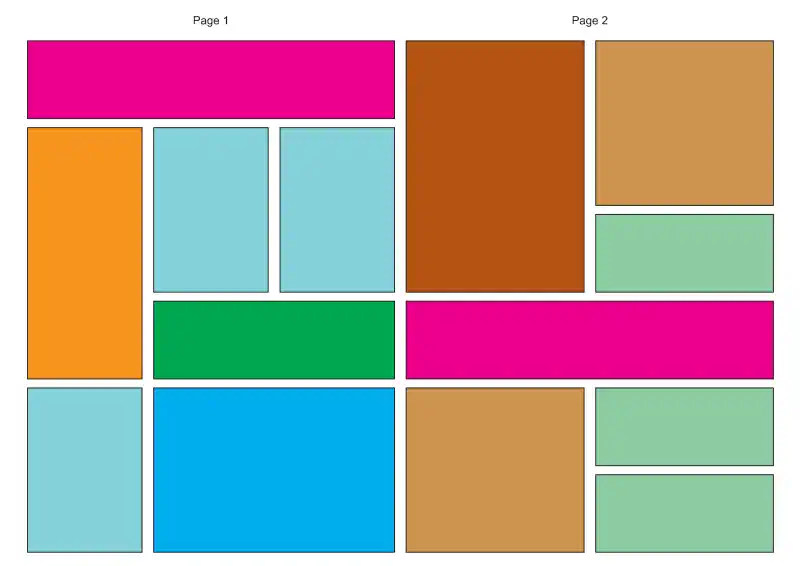 A schematic example of a dynamic design/template with different sizes of microsites (we call them “forms”) from which a complete page is composed. Within the different sizes, the elements can adapt to each other. For example, images can adapt to the amount of text, the size of tables or other images (black text objects) or the texts can overlay the images (white transparent text objects). This technique goes far beyond the possibilities you know from layout programs like VivaDesigner or InDesign.