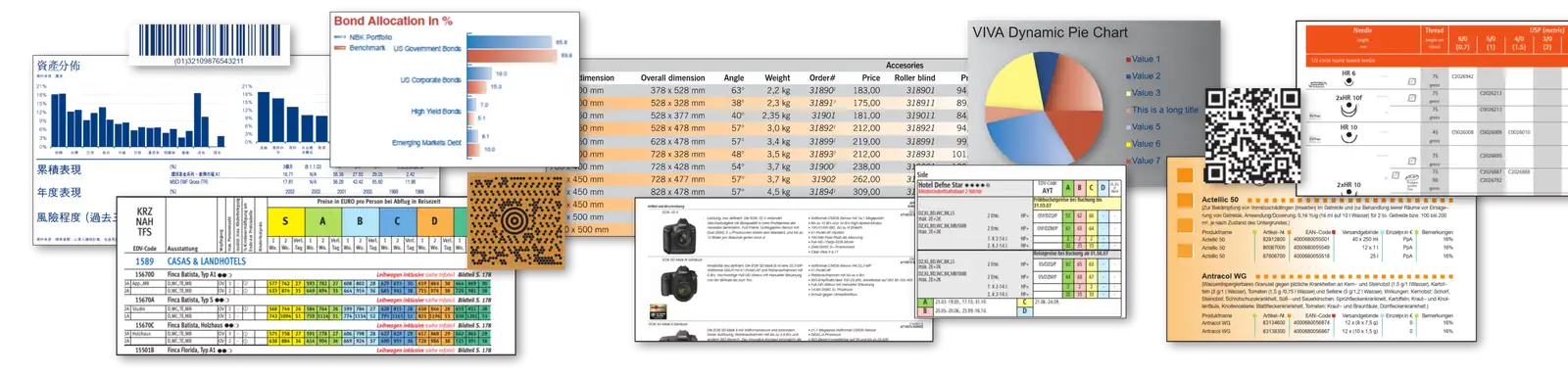 Create static or highly dynamic designs/templates with Database Publishing. Automate the use of Alias Pages and styles, and dynamically create graphics, text, pictures, tables, QR codes, barcodes, charts, graphs or Viva XML objects from any data source or script.