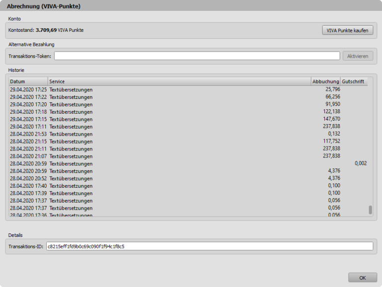 - Wählen Sie Hilfe > Abrechnung (VIVA-Punkte), um den Kontostand in einem VIVA-Programm aufzurufen. Jeder Transaktion wird eine eindeutige Transaktions-ID zugewiesen, anhand derer Sie den jeweiligen Vorgang genau nachvollziehen können.